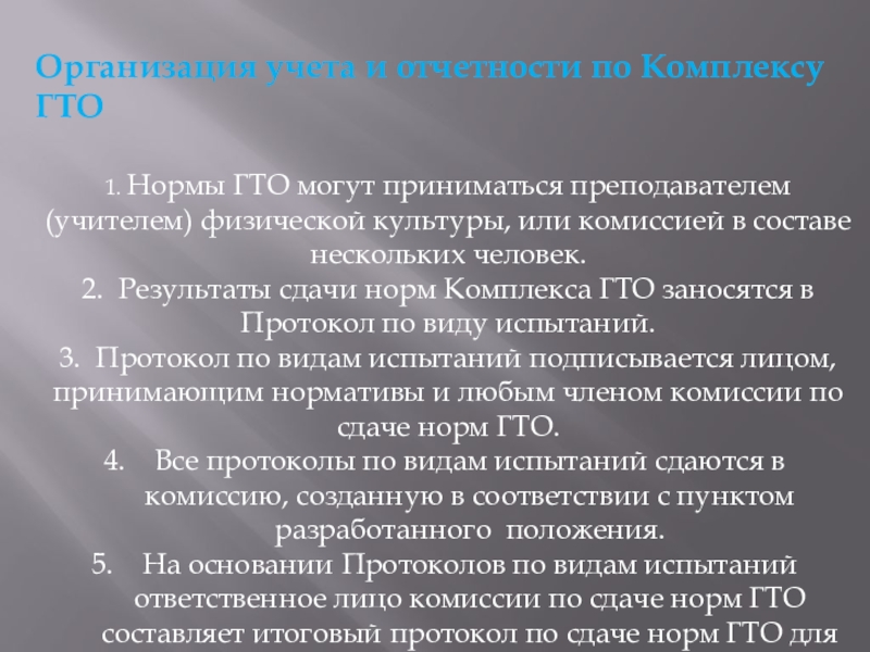 3. В комиссии может назначаться ответственное лицо (секретарь), которое оформляет Итоговые протоколы по сдаче норм комплекса ГТО.