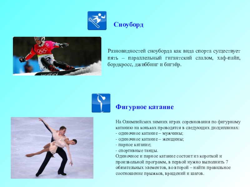 На Олимпийских зимних играх соревнования по фигурному катанию на коньках проводятся в следующих дисциплинах: