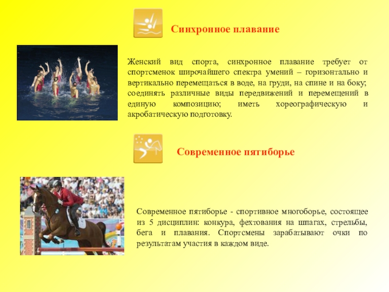 Современное пятиборье - спортивное многоборье, состоящее из 5 дисциплин: конкура, фехтования на шпагах, стрельбы, бега и плавания. Спортсмены зарабатывают очки по результатам участия в каждом виде.