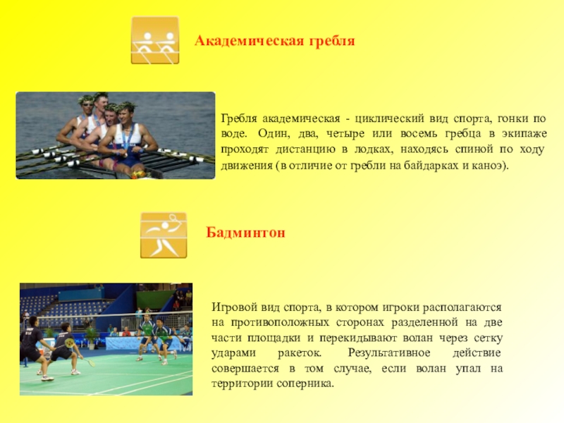 Игровой вид спорта, в котором игроки располагаются на противоположных сторонах разделенной на две части площадки и перекидывают волан через сетку ударами ракеток. Результативное действие совершается в том случае, если волан упал на территории соперника.