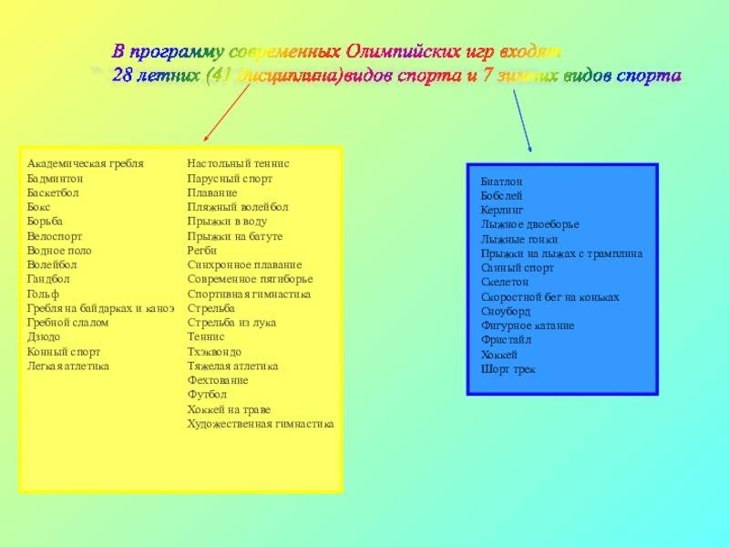 28 летних (41 дисциплина)видов спорта и 7 зимних видов спорта