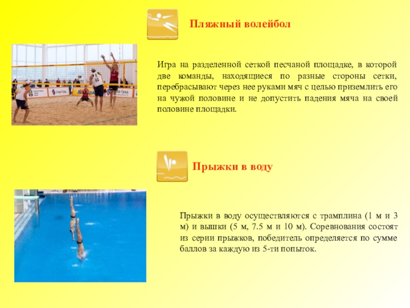 Прыжки в воду осуществляются с трамплина (1 м и 3 м) и вышки (5 м, 7.5 м и 10 м). Соревнования состоят из серии прыжков, победитель определяется по сумме баллов за каждую из 5-ти попыток.