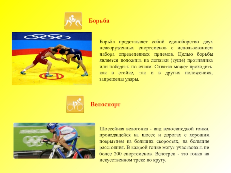 Шоссейная велогонка - вид велосипедной гонки, проводящейся на шоссе и дорогах с хорошим покрытием на больших скоростях, на большие расстояния. В каждой гонке могут участвовать не более 200 спортсменов. Велотрек - это гонка на искусственном треке по кругу.