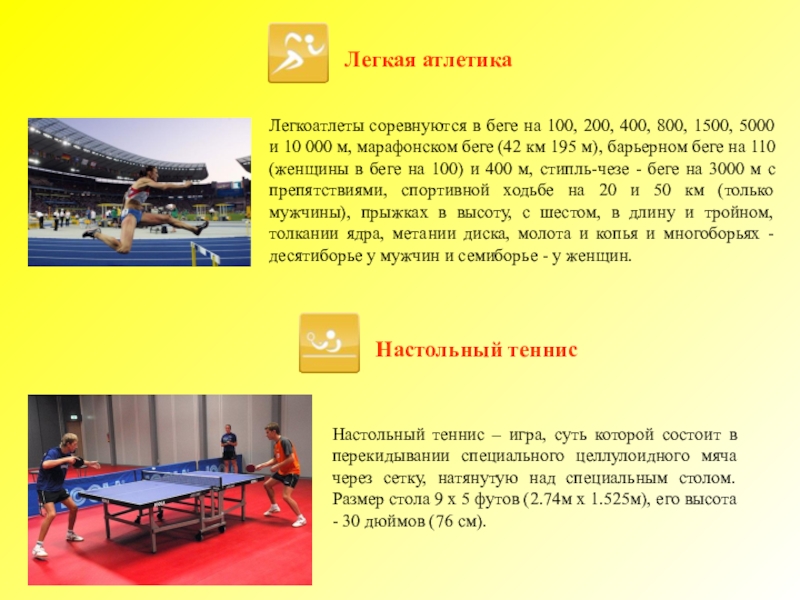 Настольный теннис – игра, суть которой состоит в перекидывании специального целлулоидного мяча через сетку, натянутую над специальным столом. Размер стола 9 х 5 футов (2.74м х 1.525м), его высота - 30 дюймов (76 см).