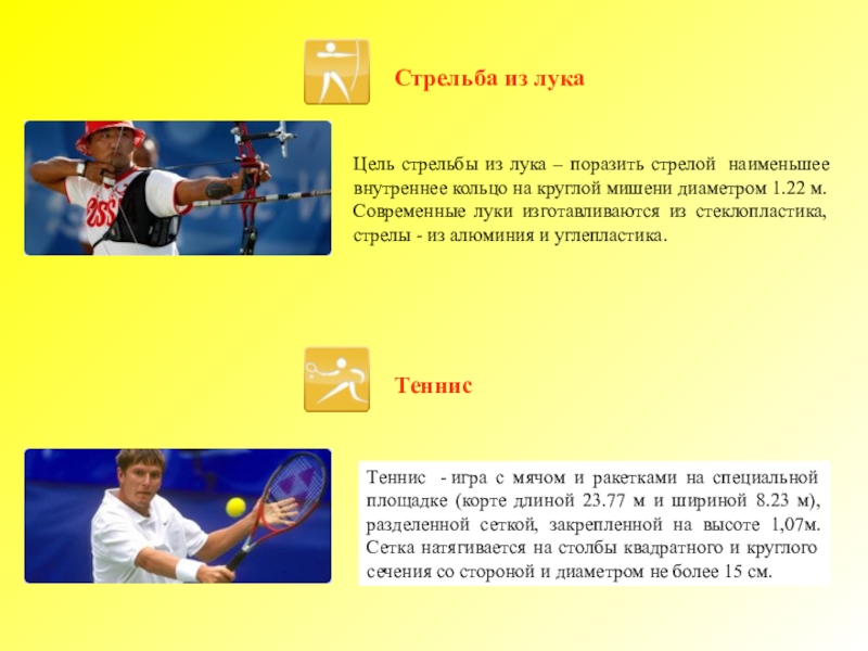 Теннис - игра с мячом и ракетками на специальной площадке (корте длиной 23.77 м и шириной 8.23 м), разделенной сеткой, закрепленной на высоте 1,07м. Сетка натягивается на столбы квадратного и круглого сечения со стороной и диаметром не более 15 см.