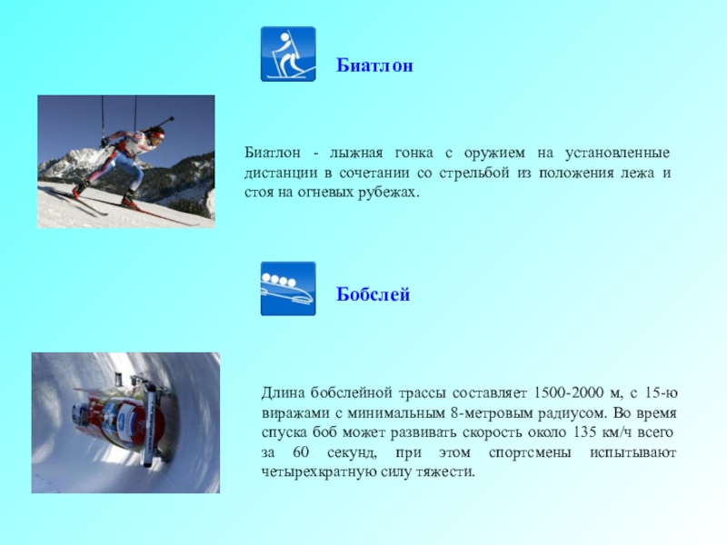 Длина бобслейной трассы составляет 1500-2000 м, с 15-ю виражами с минимальным 8-метровым радиусом. Во время спуска боб может развивать скорость около 135 км/ч всего за 60 секунд, при этом спортсмены испытывают четырехкратную силу тяжести.