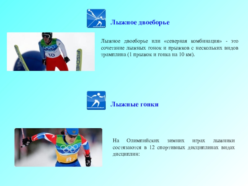 На Олимпийских зимних играх лыжники состязаются в 12 спортивных дисциплинах видах дисциплин: