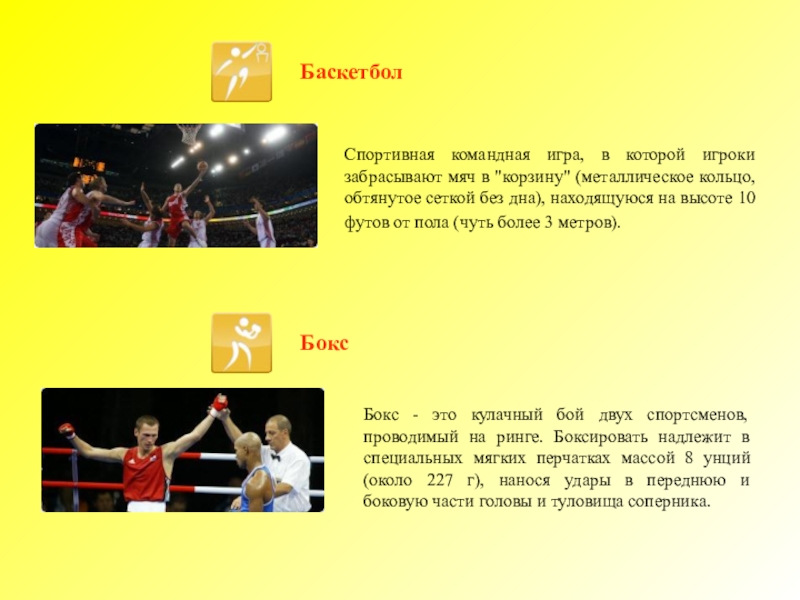 Бокс - это кулачный бой двух спортсменов, проводимый на ринге. Боксировать надлежит в специальных мягких перчатках массой 8 унций (около 227 г), нанося удары в переднюю и боковую части головы и туловища соперника.