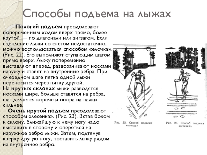 Способы подъема на лыжах		Пологий подъем преодолевают попеременным ходом вверх прямо, более крутой — по диагонали или зигзагом.