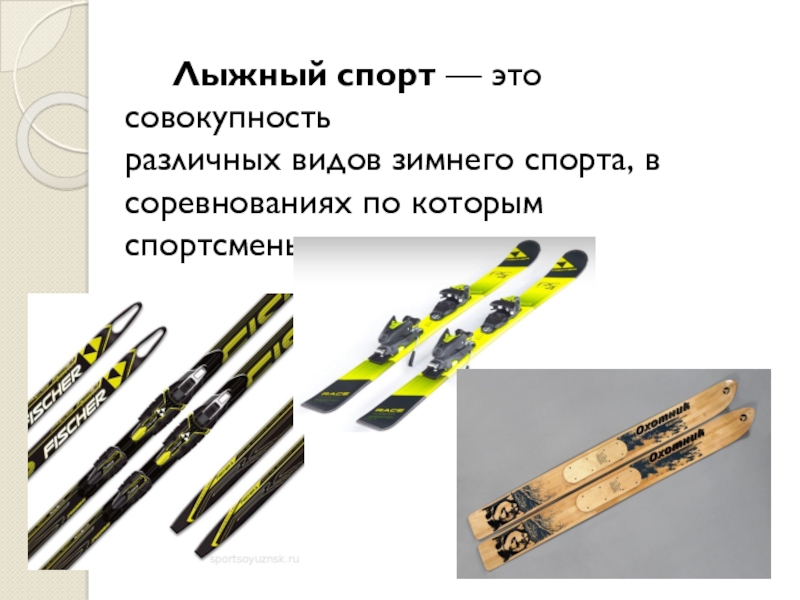 Слайд 2 Лыжный спорт — это совокупность различных видов зимнего спорта, в соревнованиях по которым спортсмены используют лыжи.