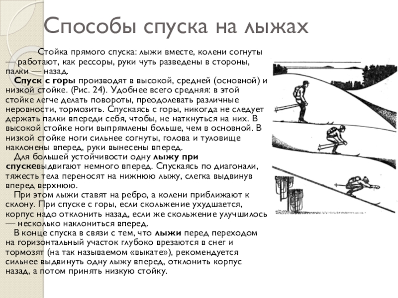 — работают, как рессоры, руки чуть разведены в стороны, палки — назад.    Спуск с горы производят в высокой, средней (основной) и низкой стойке. (Рис. 24). Удобнее всего средняя: в этой стойке легче делать повороты, преодолевать различные неровности, тормозить. Спускаясь с горы, никогда не следует держать палки впереди себя, чтобы, не наткнуться на них. В высокой стойке ноги выпрямлены больше, чем в основной. В низкой стойке ноги сильнее согнуты, голова и туловище наклонены вперед, руки вынесены вперед.    Для большей устойчивости одну лыжу при спускевыдвигают немного вперед. Спускаясь по диагонали, тяжесть тела переносят на нижнюю лыжу, слегка выдвинув вперед верхнюю.    При этом лыжи ставят на ребро, а колени приближают к склону. При спуске с горы, если скольжение ухудшается, корпус надо отклонить назад, если же скольжение улучшилось — несколько наклониться вперед.    В конце спуска в связи с тем, что лыжи перед переходом на горизонтальный участок глубоко врезаются в снег и тормозят (на так называемом «выкате»), рекомендуется сильнее выдвинуть одну лыжу вперед, отклонить корпус назад, а потом принять низкую стойку.