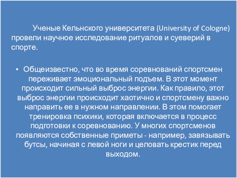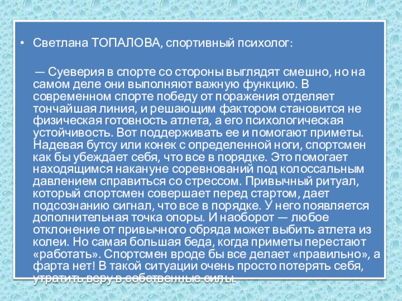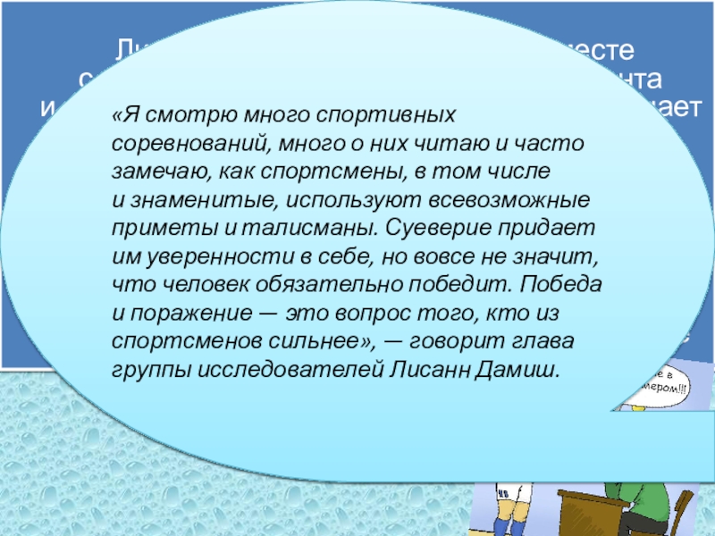 «Я смотрю много спортивных соревнований, много о них читаю и часто замечаю, как спортсмены, в том числе и знаменитые, используют всевозможные приметы и талисманы. Суеверие придает им уверенности в себе, но вовсе не значит, что человек обязательно победит. Победа и поражение — это вопрос того, кто из спортсменов сильнее», — говорит глава группы исследователей Лисанн Дамиш.