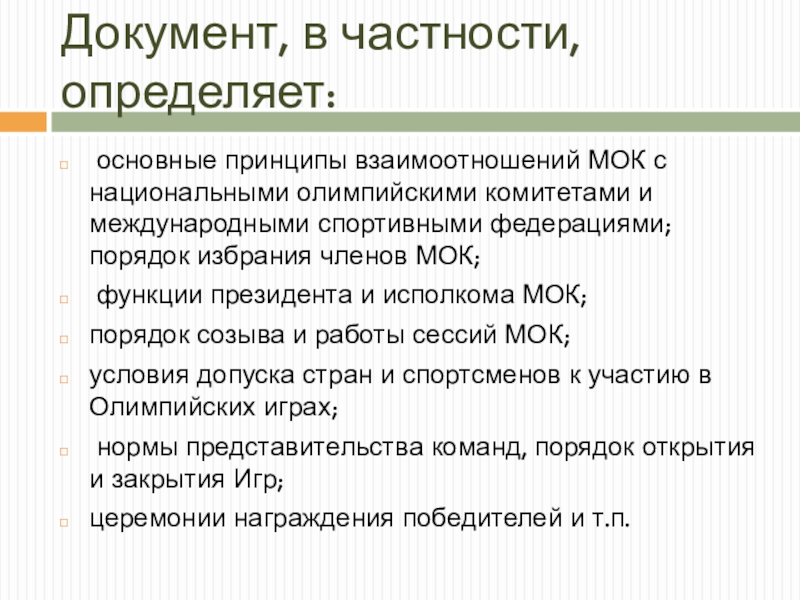 в частности, записано: "Олимпийская хартия сводит в единый кодекс основополагающие принципы, правила и официальные разъяснения, принятые МОК. Она управляет организацией и функционированием олимпийскою движения и устанавливает условия празднования Олимпийских игр".
