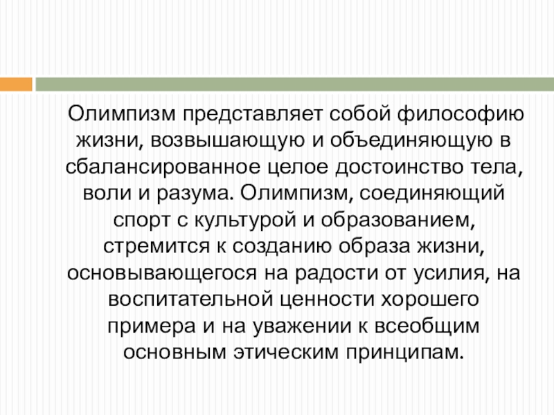 Слайд 14 Олимпизм представляет собой философию жизни, возвышающую и объединяющую в