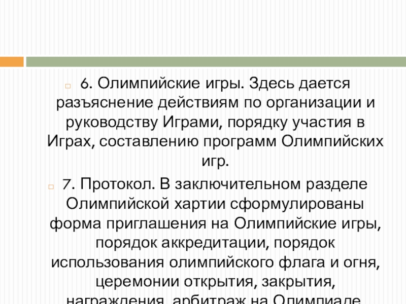 7. Протокол. В заключительном разделе Олимпийской хартии сформулированы форма приглашения на Олимпийские игры, порядок аккредитации, порядок использования олимпийского флага и огня, церемонии открытия, закрытия, награждения, арбитраж на Олимпиаде.