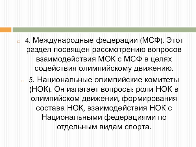 5. Национальные олимпийские комитеты (НОК). Он излагает вопросы: роли НОК в олимпийском движении, формирования состава НОК, взаимодействия НОК с Национальными федерациями по отдельным видам спорта.