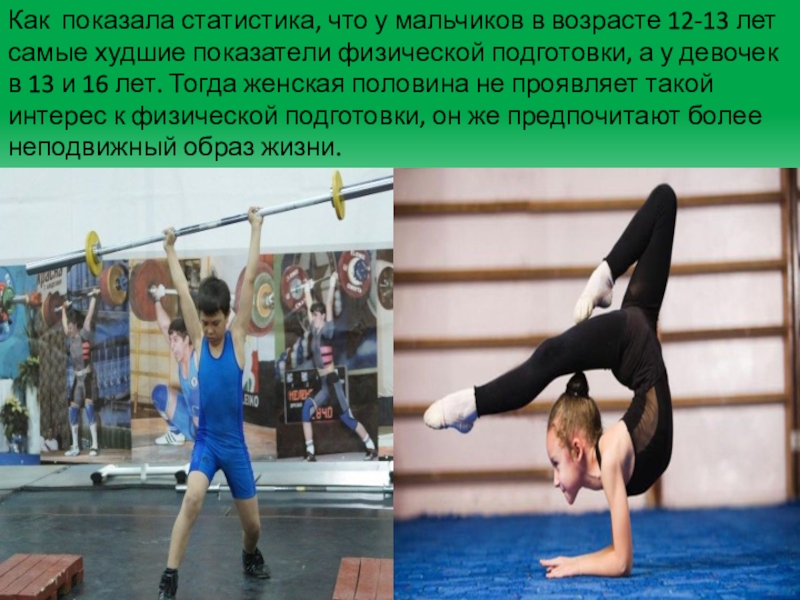 самые худшие показатели физической подготовки, а у девочек в 13 и 16 лет. Тогда женская половина не проявляет такой интерес к физической подготовки, он же предпочитают более неподвижный образ жизни.