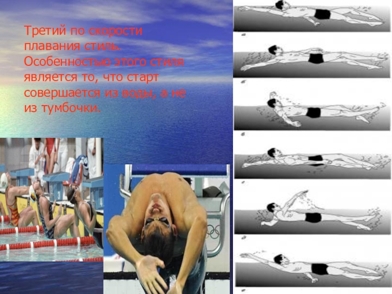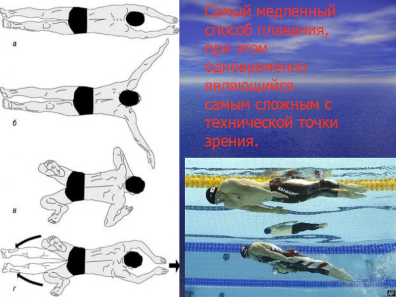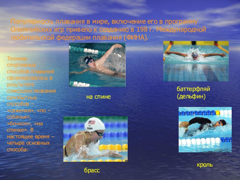 Техника спортивных способов плавания сформировалась в результате совершенствования самобытных способов – «саженки», «по – собачьи», «бочком», «на спинке». В настоящее время – четыре основных способа: