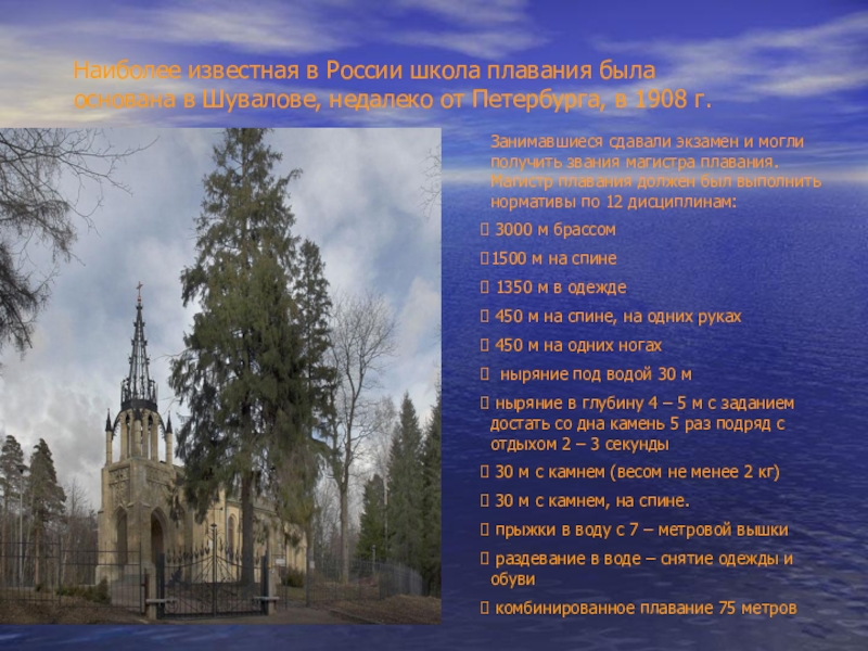 Занимавшиеся сдавали экзамен и могли получить звания магистра плавания. Магистр плавания должен был выполнить нормативы по 12 дисциплинам: