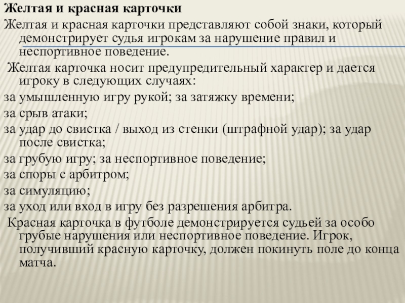 Желтая и красная карточки представляют собой знаки, который демонстрирует судья игрокам за нарушение правил и неспортивное поведение.
