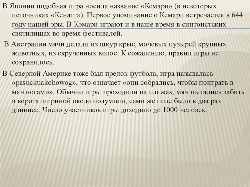 В Австралии мячи делали из шкур крыс, мочевых пузырей крупных животных, из скрученных волос. К сожалению, правил игры не сохранилось.