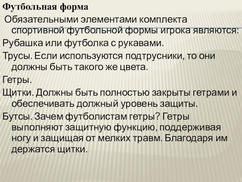 Бутсы. Зачем футболистам гетры? Гетры выполняют защитную функцию, поддерживая ногу и защищая от мелких травм. Благодаря им держатся щитки.