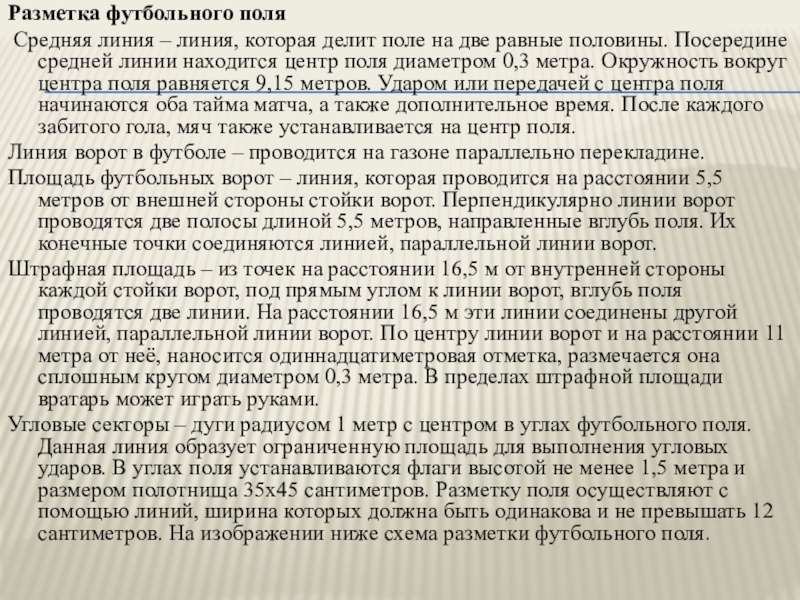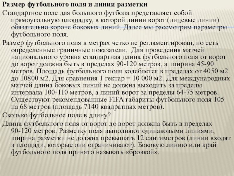 Длина футбольного поля от ворот до ворот должна быть в пределах 90-120 метров. Разметку поля выполняют одинаковыми линиями, ширина разметки не должна превышать 12 сантиметров (линии входят в площади, которые они ограничивают). Боковую линию или край футбольного поля принято называть «бровкой».