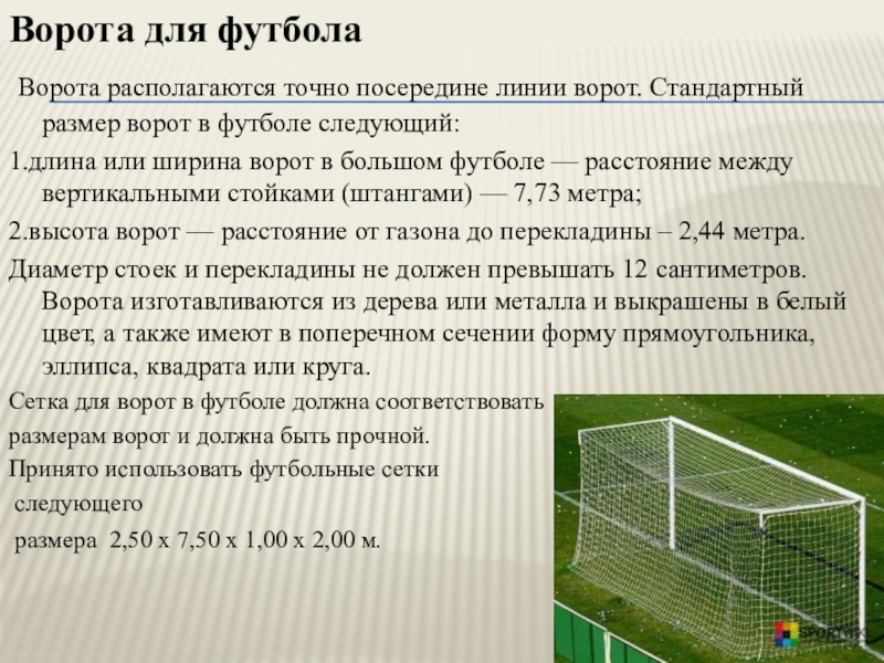 1.длина или ширина ворот в большом футболе — расстояние между вертикальными стойками (штангами) — 7,73 метра;