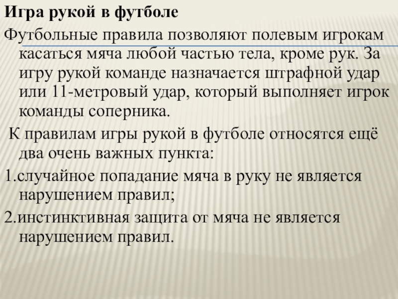 К правилам игры рукой в футболе относятся ещё два очень важных пункта: