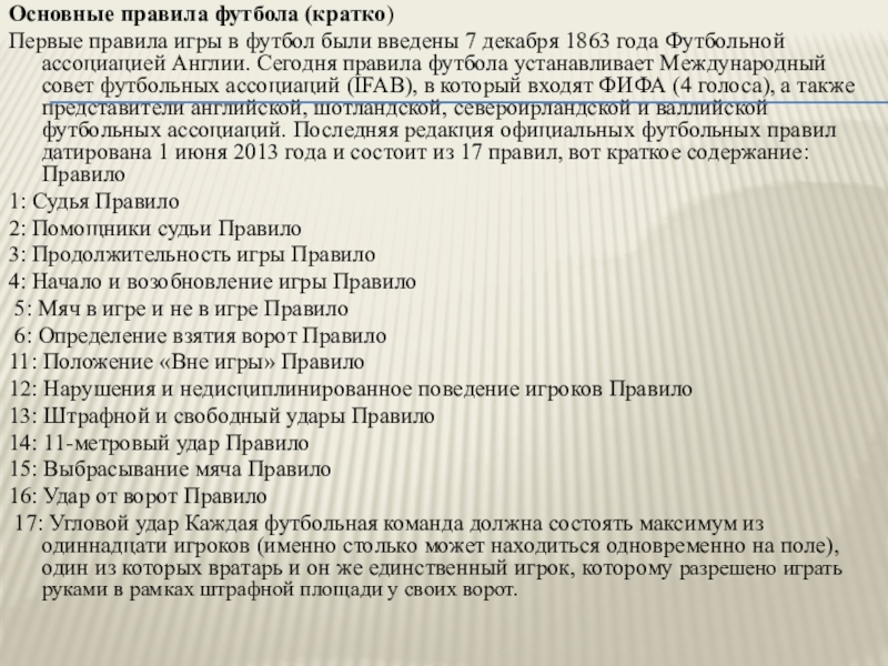 Первые правила игры в футбол были введены 7 декабря 1863 года Футбольной ассоциацией Англии. Сегодня правила футбола устанавливает Международный совет футбольных ассоциаций (IFAB), в который входят ФИФА (4 голоса), а также представители английской, шотландской, североирландской и валлийской футбольных ассоциаций. Последняя редакция официальных футбольных правил датирована 1 июня 2013 года и состоит из 17 правил, вот краткое содержание: Правило