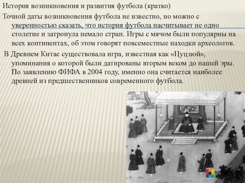 В Древнем Китае существовала игра, известная как «Цуцзюй», упоминания о которой были датированы вторым веком до нашей эры. По заявлению ФИФА в 2004 году, именно она считается наиболее древней из предшественников современного футбола.