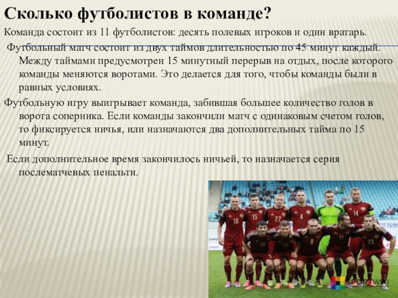 17: Угловой удар Каждая футбольная команда должна состоять максимум из одиннадцати игроков (именно столько может находиться одновременно на поле), один из которых вратарь и он же единственный игрок, которому разрешено играть руками в рамках штрафной площади у своих ворот.