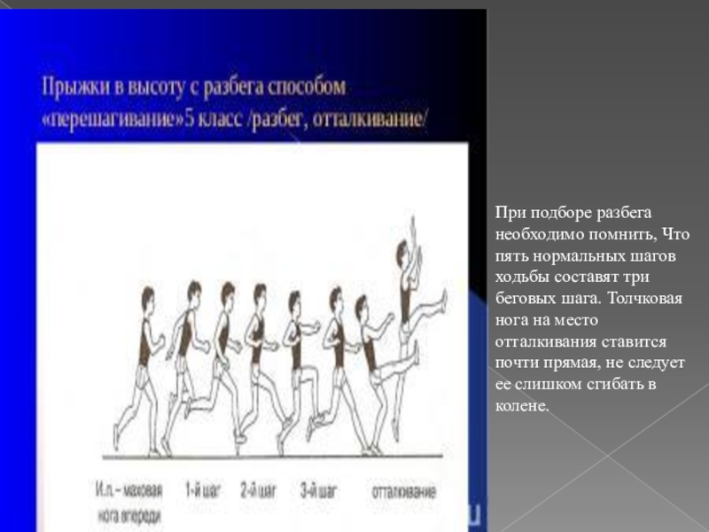 При подборе разбега необходимо помнить, Что пять нормальных шагов ходьбы