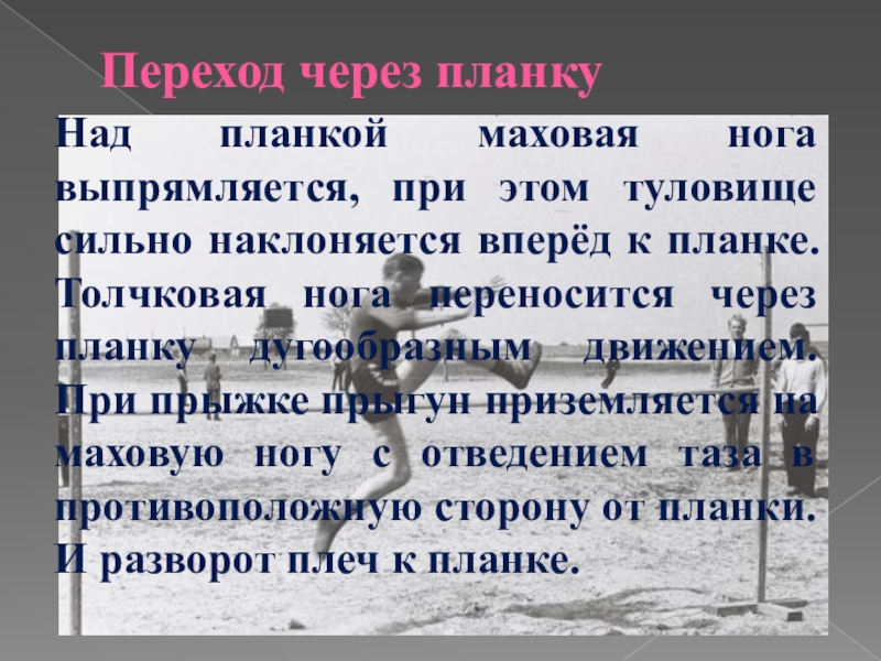 Над планкой маховая нога выпрямляется, при этом туловище сильно