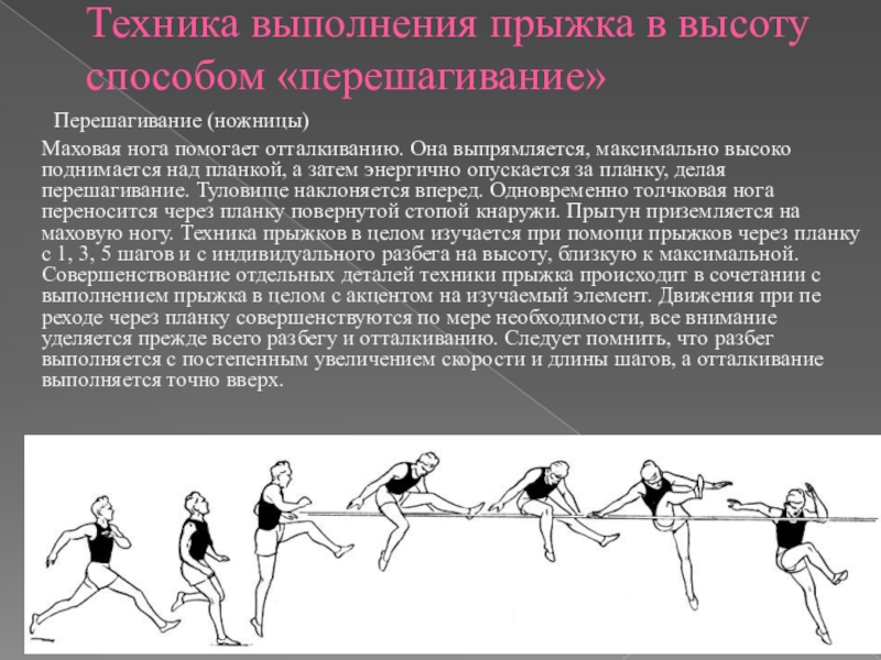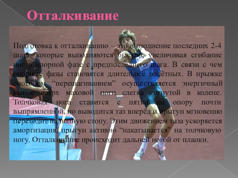 быстро, увеличивая сгибание ног в опорной фазе с предпоследнего шага. В связи с чем опорные фазы становятся длительнее полётных. В прыжке способом “перешагиванием” осуществляется энергичный вынос вверх маховой ноги слегка согнутой в колене. Толчковая нога ставится с пятки на опору почти выпрямленной, но выводится таз вперёд и прыгун мгновенно переходит на полную стопу. Этим движением таза ускоряется амортизация, прыгун активно “накатывается” на толчковую ногу. Отталкивание происходит дальней ногой от планки.
