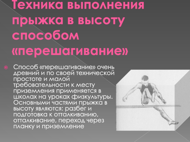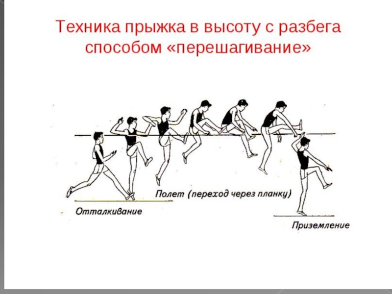 Слайд 4Техника выполнения прыжка в высоту способом «перешагивание»
