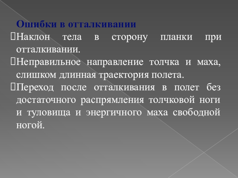 Переход после отталкивания в полет без достаточного распрямления толчковой ноги и туловища и энергичного маха свободной ногой.