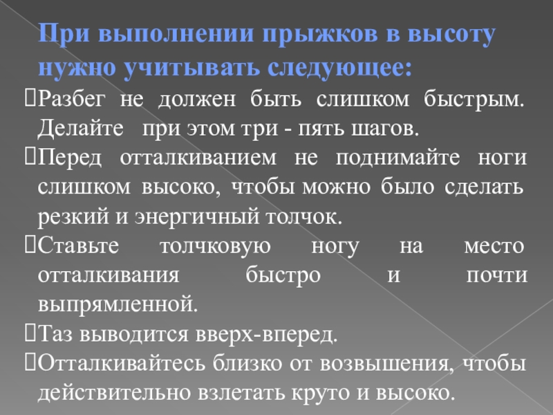 Слайд 25При выполнении прыжков в высоту нужно учитывать следующее: