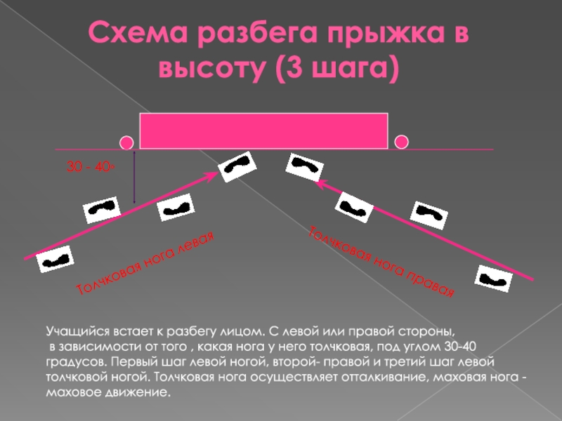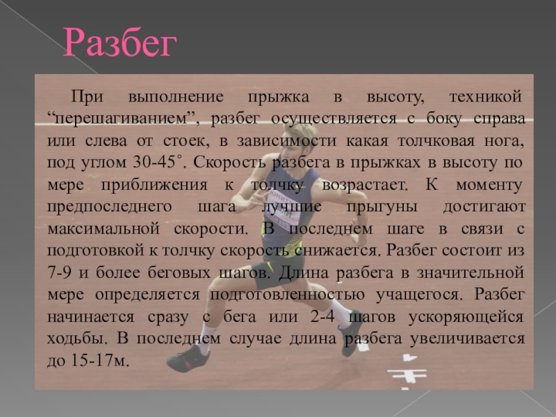 боку справа или слева от стоек, в зависимости какая толчковая нога, под углом 30-45˚. Скорость разбега в прыжках в высоту по мере приближения к толчку возрастает. К моменту предпоследнего шага лучшие прыгуны достигают максимальной скорости. В последнем шаге в связи с подготовкой к толчку скорость снижается. Разбег состоит из 7-9 и более беговых шагов. Длина разбега в значительной мере определяется подготовленностью учащегося. Разбег начинается сразу с бега или 2-4 шагов ускоряющейся ходьбы. В последнем случае длина разбега увеличивается до 15-17м.