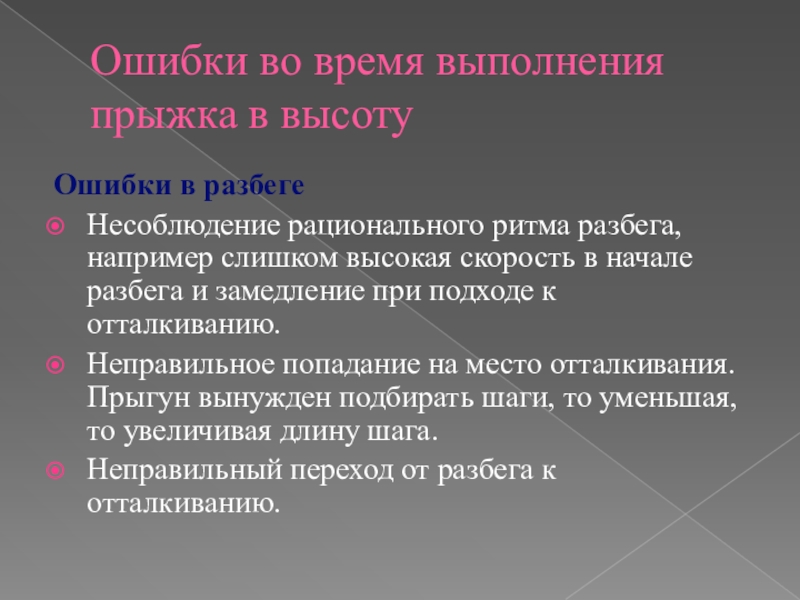 рационального ритма разбега, например слишком высокая скорость в начале разбега и замедление при подходе к отталкиванию.