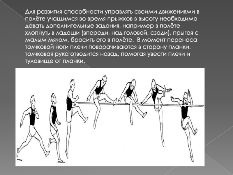 Слайд 20Для развития способности управлять своими движениями в полёте учащимся во время