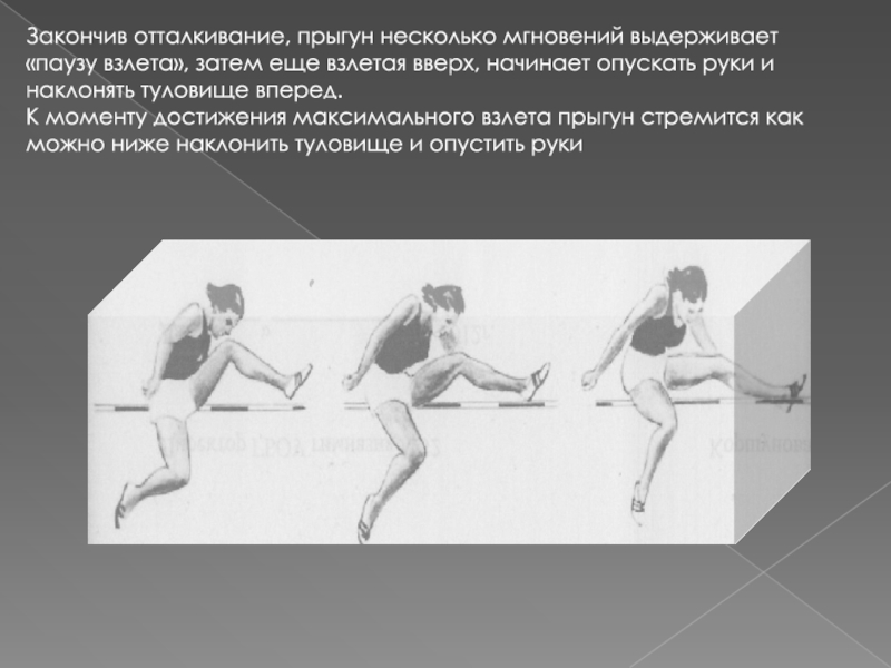 Слайд 17Закончив отталкивание, прыгун несколько мгновений выдерживает «паузу взлета», затем еще взлетая
