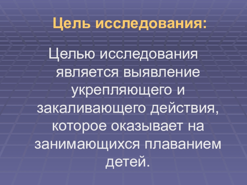 Цель исследования: Целью исследования является выявление укрепляющего и закаливающего действия, которое оказывает на занимающихся плаванием детей.
