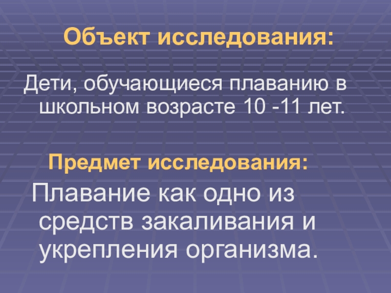 Объект исследования:  Дети, обучающиеся плаванию в школьном возрасте 10 -11 лет.  Предмет исследования:  Плавание как одно из