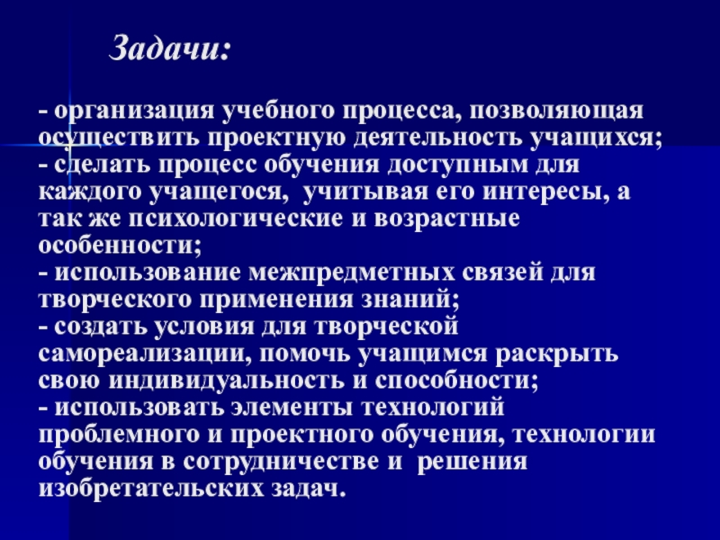 - сделать процесс обучения доступным для каждого учащегося, учитывая его интересы, а так же психологические и возрастные особенности;