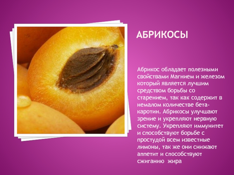 средством борьбы со старением, так как содержит в немалом количестве бета-каротин. Абрикосы улучшают зрение и укрепляют нервную систему. Укрепляют иммунитет и способствуют борьбе с простудой всем известные лимоны, так же они снижают аппетит и способствуют сжиганию жира