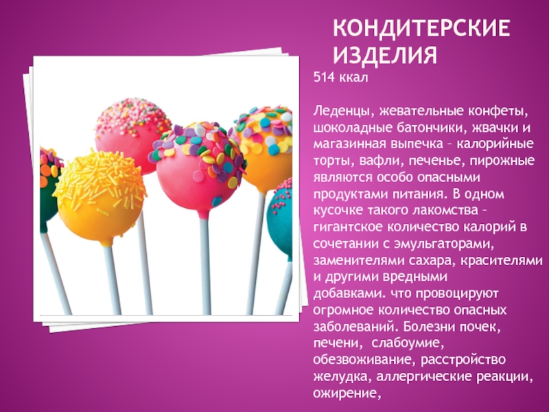 – калорийные торты, вафли, печенье, пирожные являются особо опасными продуктами питания. В одном кусочке такого лакомства – гигантское количество калорий в сочетании с эмульгаторами, заменителями сахара, красителями и другими вредными добавками. что провоцируют огромное количество опасных заболеваний. Болезни почек, печени, слабоумие, обезвоживание, расстройство желудка, аллергические реакции, ожирение,
