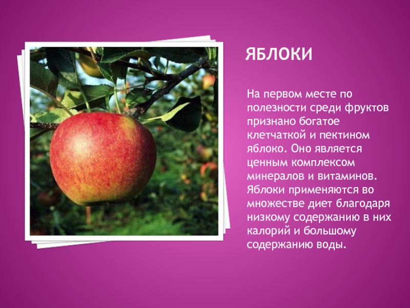 и пектином яблоко. Оно является ценным комплексом минералов и витаминов. Яблоки применяются во множестве диет благодаря низкому содержанию в них калорий и большому содержанию воды.