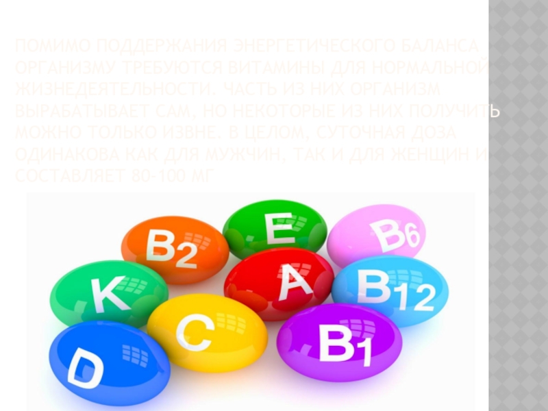 Слайд 13Помимо поддержания энергетического баланса организму требуются витамины для нормальной жизнедеятельности. Часть