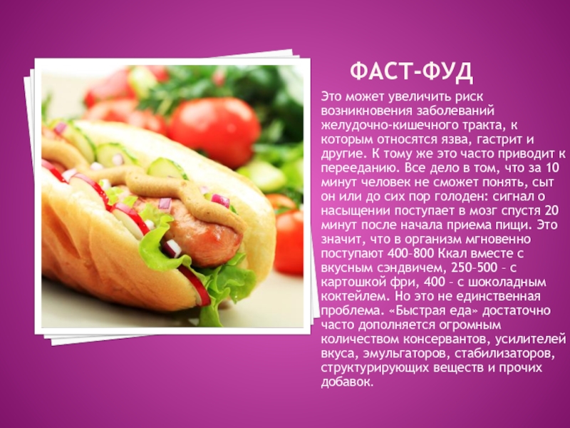язва, гастрит и другие. К тому же это часто приводит к перееданию. Все дело в том, что за 10 минут человек не сможет понять, сыт он или до сих пор голоден: сигнал о насыщении поступает в мозг спустя 20 минут после начала приема пищи. Это значит, что в организм мгновенно поступают 400–800 Ккал вместе с вкусным сэндвичем, 250–500 – с картошкой фри, 400 – с шоколадным коктейлем. Но это не единственная проблема. «Быстрая еда» достаточно часто дополняется огромным количеством консервантов, усилителей вкуса, эмульгаторов, стабилизаторов, структурирующих веществ и прочих добавок.